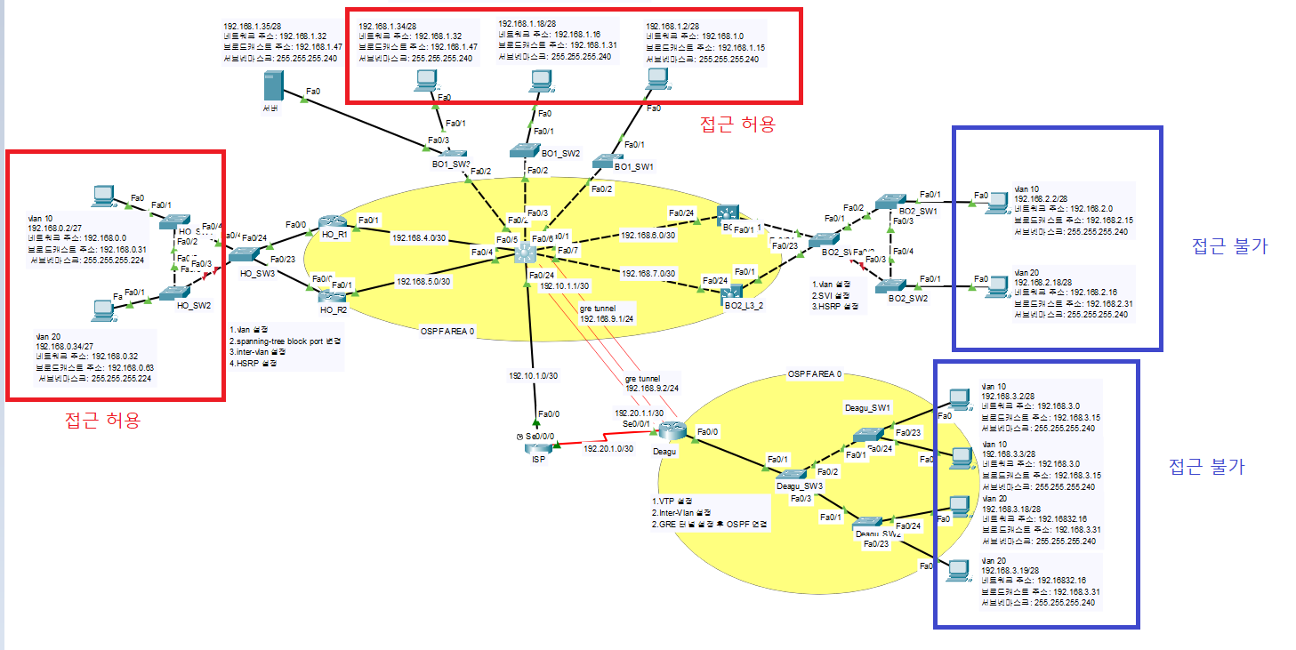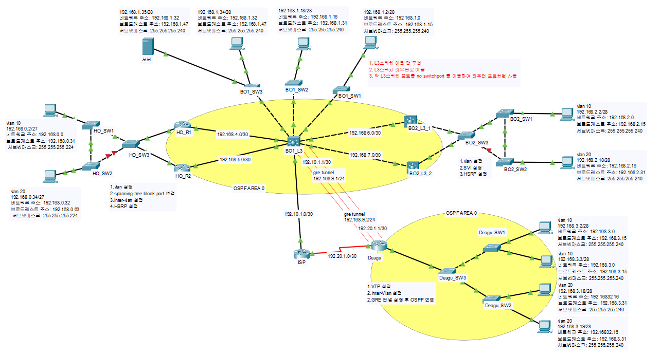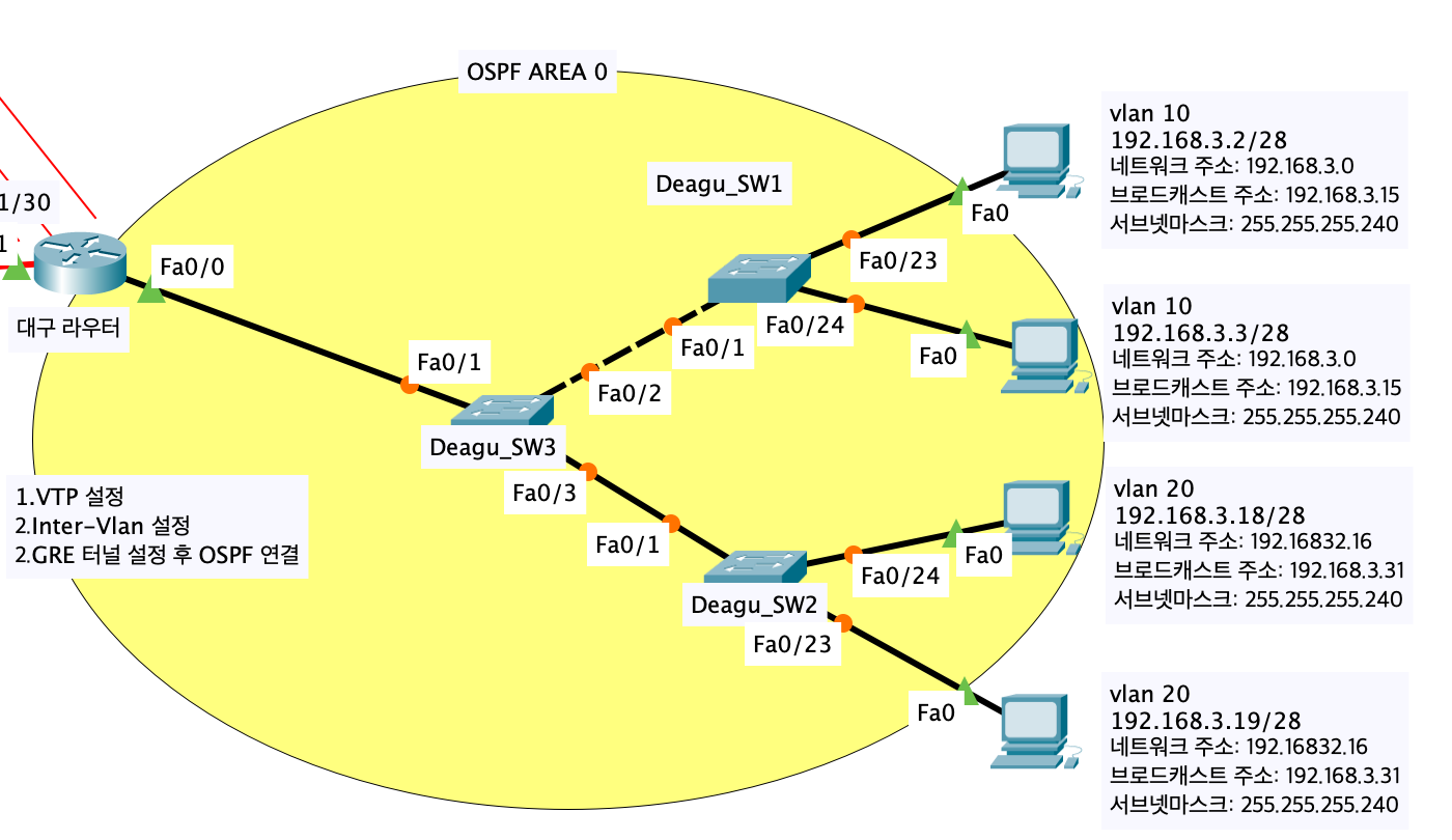 3. 기능 : vlan, VTP, 스위치 이중화 구현, Inter-vlan, SVI, OSPF, GRE Tunnel, ACL
