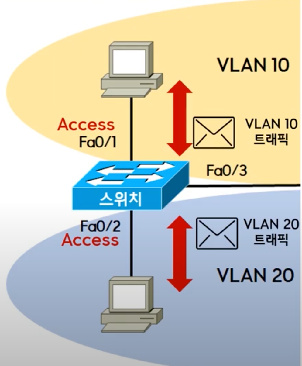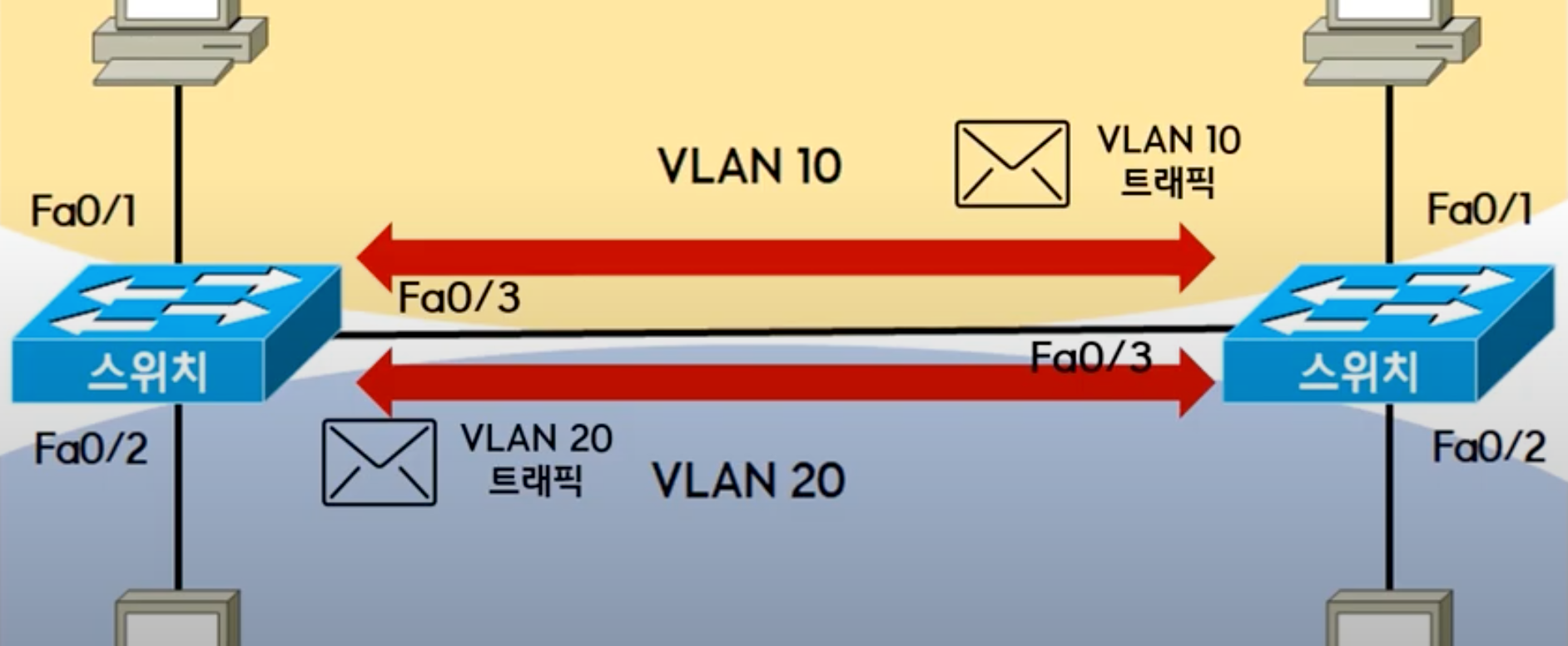 - Trunking Protocol 이용해 vlan 트래픽을 식별