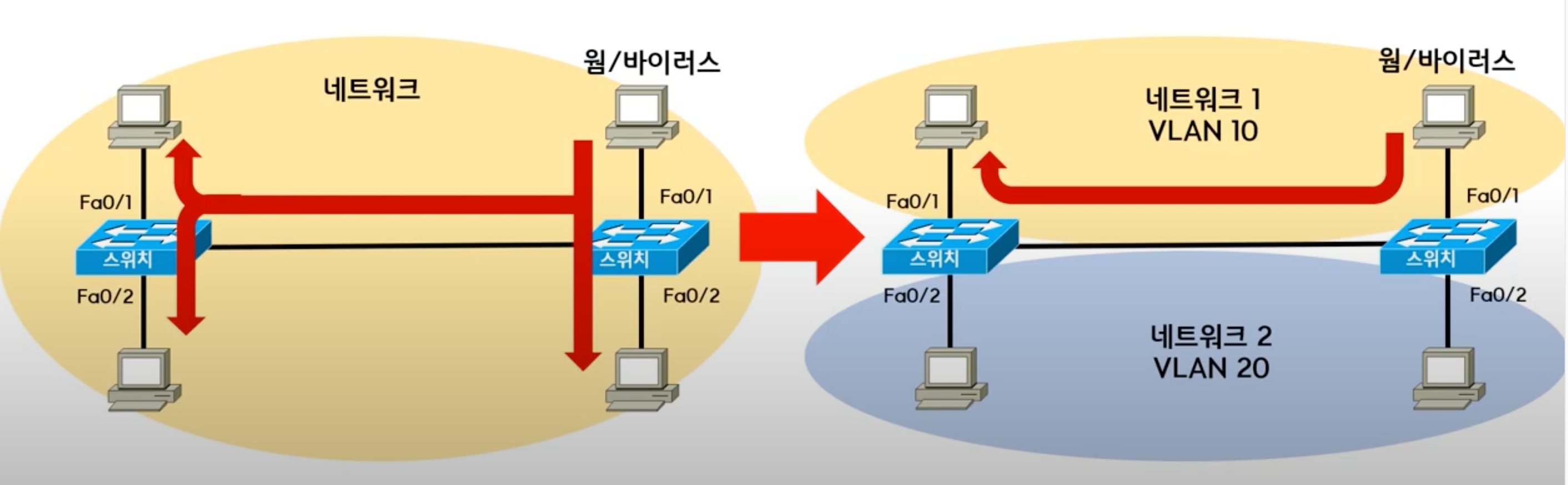 - 브로드캐스트 프레임 전달 범위를 제한함으로써 네트워크 트래픽 감소, 웜이나 바이러스의 전파 범위를 제한